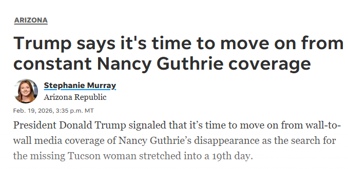 President Donald Trump signaled that it’s time to move on from wall-to-wall media coverage of Nancy Guthrie’s disappearance as the search for the missing Tucson woman stretched into a 19th day.